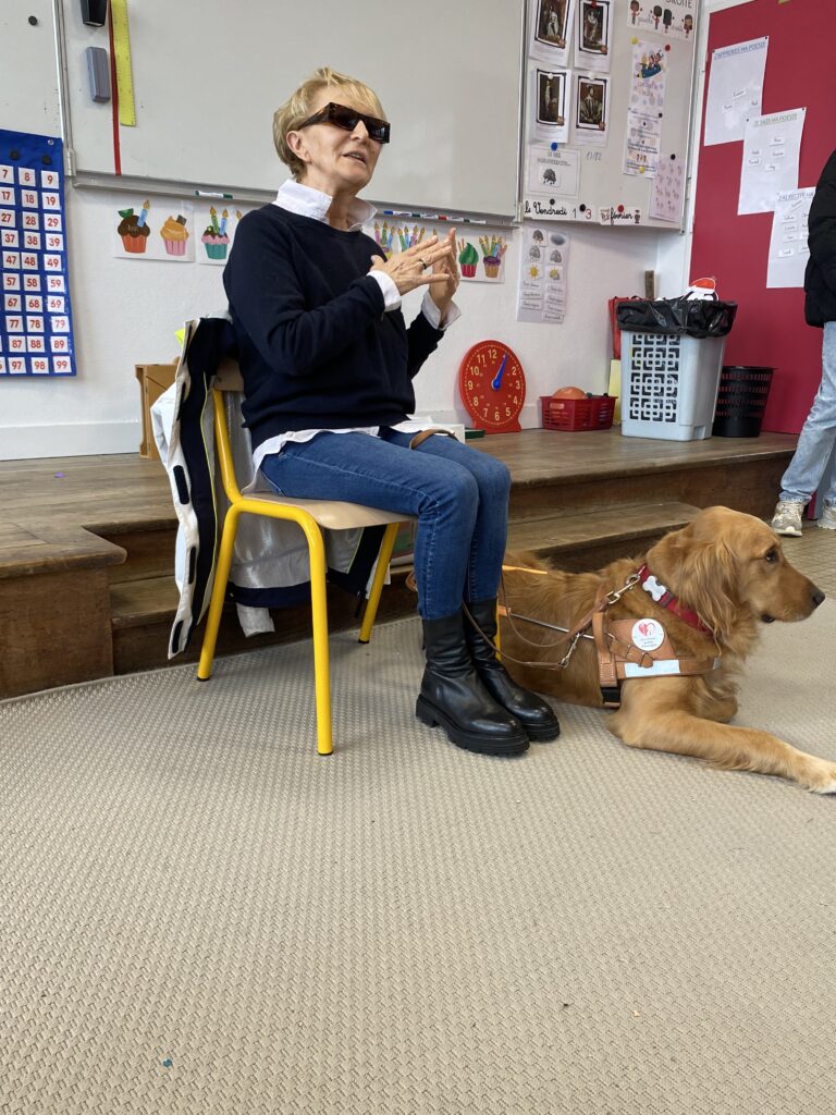 Dans ce cadre, nous avons eu la chance d’accueillir Nicole, directrice de l’association Association Chiens Guides d’Aveugles du Morbihan, qui est venue à l’école avec son chien guide Totem.